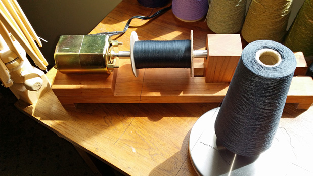 I begin with half-pound cones, winding them onto spools before creating a warp.