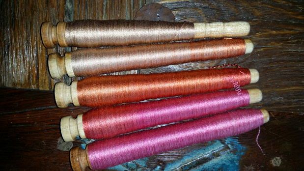 Once dyed, the knit material is unraveled and wound onto pirns, now ready to weave!