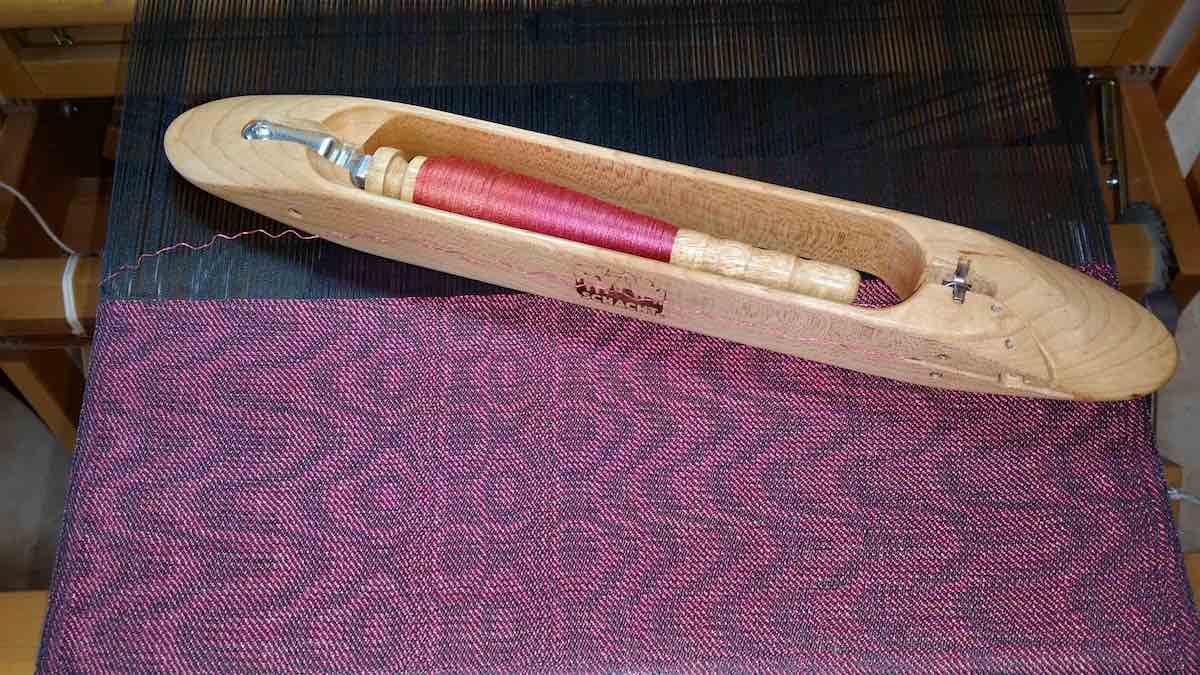 I weave my fine silks on an 8 harness floor loom. To add visual complexity, the treadling pattern often has a repeat of 60 to over 100 throws of the shuttle in length.